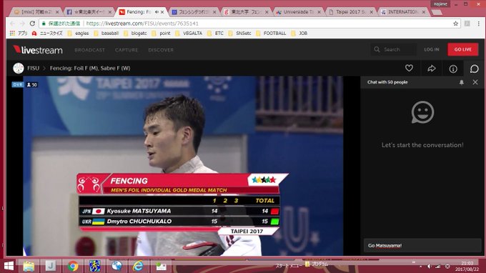 #台北ユニバーシアード フェンシング・男子個人フルーレ、準決勝で松山恭助(早稲田大)がHERTSYK Rostyslav UKRを15-6で破り決勝進出!決勝は2050JST予定。 www.2017.taipei/home/detail/co…