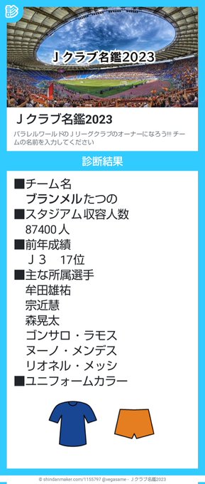 ■チーム名 ブランメルたつの ■スタジアム収容人数 87400人 ■前年成績 J3 17位 ■主な所属選手 牟田雄祐 宗近慧 森晃太 ゴンサロ・ラモス ヌーノ・メンデス リオネル・メッシ ■ユニフォームカラー … #Jパラレルクラブ #shindanmaker shindanmaker.com/1155797 pic.twitter.com/n01Leoi058