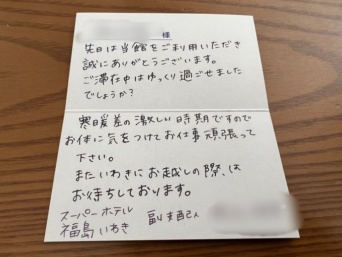 ここのホテルのサービスやばい選手権入賞スーパーホテル福島いわき地域共通クーポン3000円分をホテルの部屋に忘れてしまい、電話で「もう戻れないのでスタッフの皆さんで使ってください」と伝えたら、その3000円でお土産を買って送ってくれました! pic.twitter.com/DvAqJU7NiN