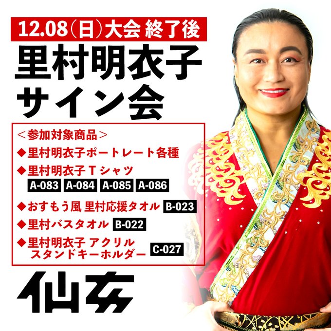 【#仙女 里村サイン会!!】大会終了後に里村明衣子サイン会開催決定!対象商品を仙女売店でご購入されたお客様が参加可能です。『女子プロレスBIGSHOW in 仙台』🗓️12.8(日)15:00-🏟️仙台サンプラザホール🎟️前売本日最終日┗c.tstar.jp/cart/performan…👀大会情報┗sendaigirls.jp/schedule/50324/#SENJO