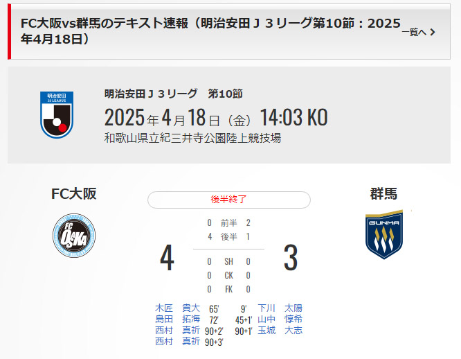 「和歌山紀三井寺でのJ3金曜デーゲーム、FC大阪vs群馬入場者数374人」でJ3記録確認してたら、とんでもない試合展開になってるそうで・・・ちなみにJ3史上最少ではない(YS横浜vsC大阪U23で337人、下部組織ホームだとJヴィレッジであったFC東京U23vs相模原の267人が最少)