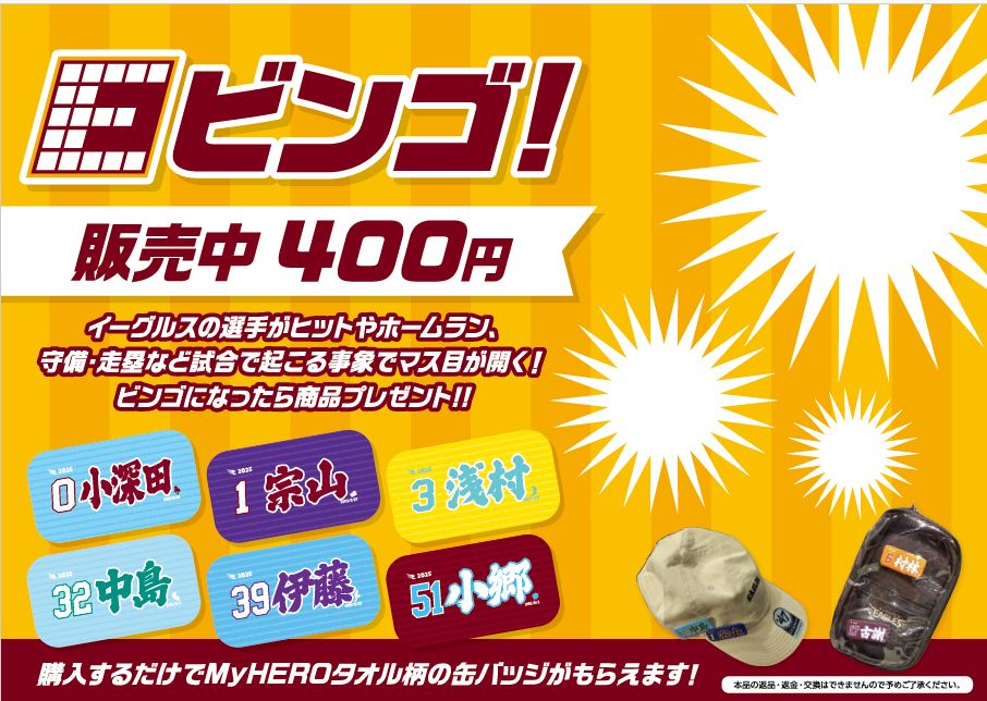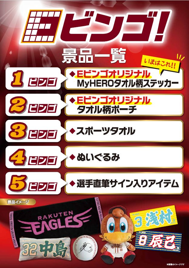 6/11(水)から【Eビンゴ】の景品が変わります🎉1ビンゴの景品は2025年デザインMyHEROタオル柄ステッカーに❗通常販売はされておらず、このEビンゴでしか手に入りません☝️商品はランダムで、全支配下登録選手対応。お気に入りの選手を狙おう🎯※2025年2月1日時点での支配下選手で作成#RakutenEagles pic.x.com/lxXSz40L5l