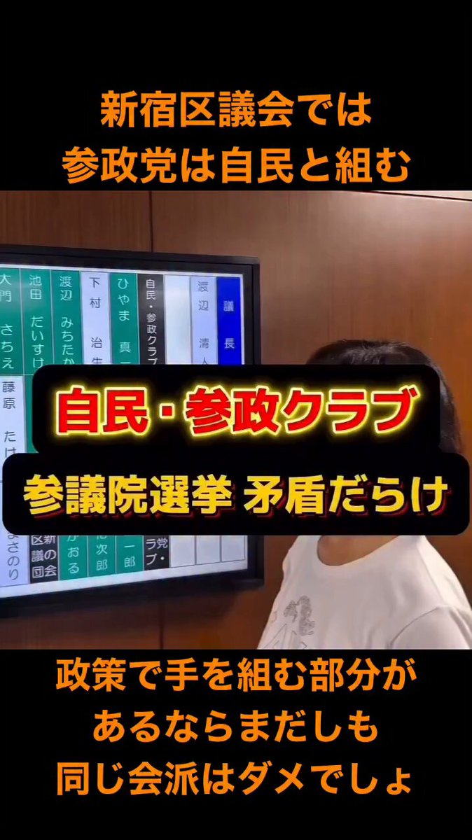 何にこれ?自民・参政クラブ って😳⁉️“反自民”のはずが…まさかの合流劇が新宿区議会で発生?新宿区議会で、自民党と…なんと参政党の議員が“会派を結成”‼️その名も《自民・参政クラブ》でもちょっと待ってください‼️参政党本体(全国政党)としては、この会派には一切入っていません🙅♀️👉合流したのは「参政党所属の“地方議員”個人」であって、党としての正式な合流ではありません。とはいえ…💬「自民をぶっ壊すって言ってたよね?」💬「反グローバリズムどこいった?」💬「一緒にやるって、どういうこと?」SNSでは、🙃「根っこは同じだったのか」🙃「自民の別働隊だったんじゃん」🙃「もう応援できない」と、参政党の熱心な支持者からも怒りと落胆の声が噴出しています😵💥一方で、共産党議員はこの会派を**「自民賛成クラブ」**と痛烈に皮肉り、TikTokでネタにして拡散中📱さらに問題なのは…🌀参政党公式はこの件に 一切言及せず沈黙中🌀地方の“判断”という形でスルーし、候補者募集の投稿を続行中💬分かる方詳しく教えてください。参政党は信じてるから何かの間違いだよね???