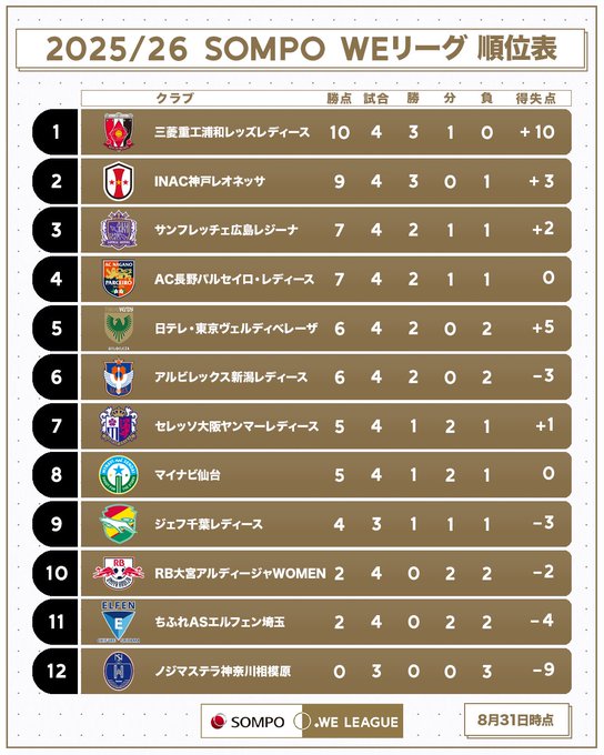 🏆2025/26 #SOMPOWEリーグ 最新順位表8月31日(日)終了時点 #WEリーグ#WEみようぜ #女子サッカー pic.x.com/3l7e8WATa1