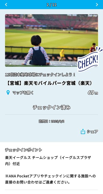 #ANAPocket で、チェックイン!∟12球団本拠地球場にチェックインしよう!∟【宮城】楽天モバイルパーク宮城(楽天)アプリはこちらから▶︎ana.ms/45U0iyX#ANA #マイル #ポイント #移動 #健康 #ポイ活 #歩いてポイント pic.x.com/r9lQAjDdEY