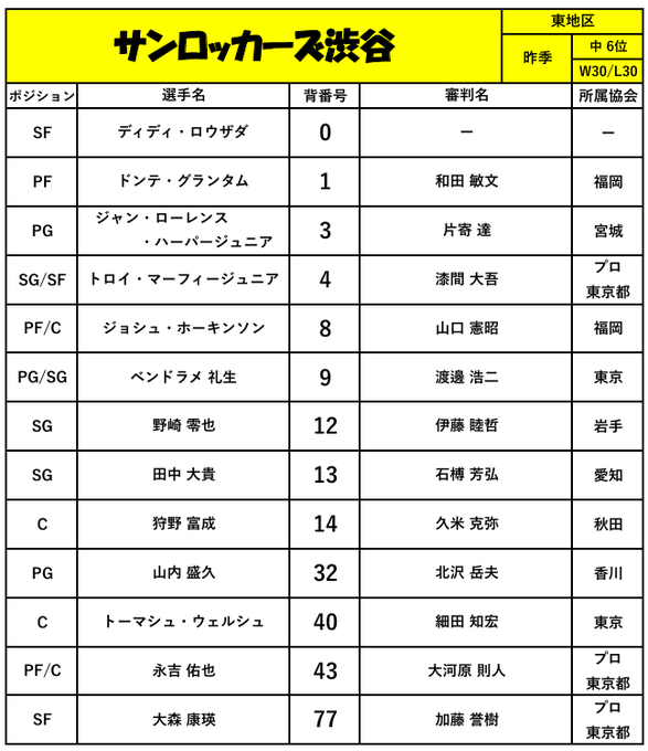 【選手と同じ背番号の審判を知ろう‼】#サンロッカーズ渋谷 25-26開幕ロスター ver.「この人知ってる!」など色々な視点でお楽しみください!※ロスターは9/18時点#Bリーグ pic.x.com/BlI3BqDJm6