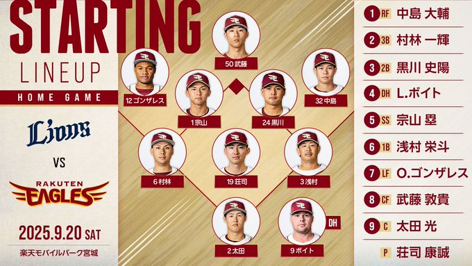 2025.9.20 vs.埼玉西武本日のスタメンはこちらです。#荘司康誠 選手と #太田光 選手のバッテリー!応援よろしくお願いします📣#RakutenEagles #キ!#ミセテクレ! pic.x.com/0Z8nWuLrxU
