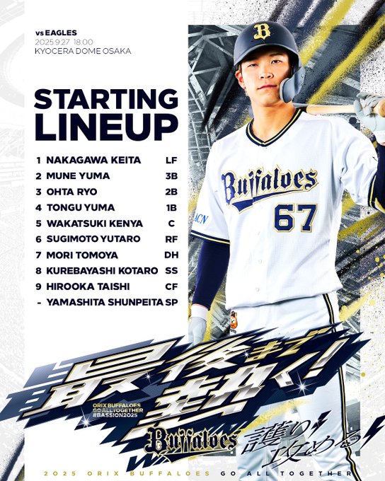 本日のスタメンはこちら!18時00分よりプレイボール!#Bs2025 #最後まで熱く pic.x.com/lD3pvmPPax
