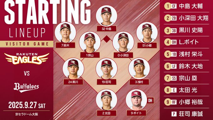 2025.9.27 vs.オリックス本日のスタメンはこちら!応援よろしくお願いします📣#RakutenEagles #キ!#ミセテクレ! pic.x.com/fnCEkvXkxf