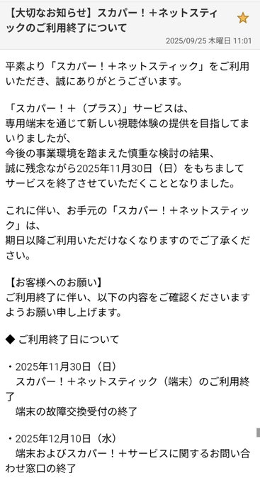 モニターとして使ってたスカパー!+ネットスティックが11月30日でサ終とのメールが来てた。いくら何でも終わるの早すぎるでしょ…1年もたなかった。 pic.x.com/1DPang5BWm