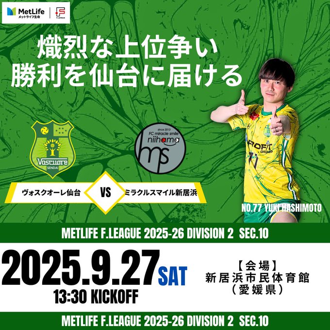 // 熾烈な上位争い 制するためにも勝利を‼️ \\ 【#メットライフ生命Fリーグ 2025-26 Div.2】 《第10節》 🗓️2025年9月27日(土) 13:30 kickoff 🏟️#新居浜市市民体育館 🆚#ミラクルスマイル新居浜 📺#FリーグTV F1昇格のためにはここから先の試合は1つも落とせません❗️会場にて、配信にて、 #ヴォスクオーレ仙台 への熱い応援🔥 よろしくお願いします💚🤝💛 ----------------- Fリーグ見るなら「FリーグTV」🎥 リンクはこちら🔽 🔗fleague.stores.play.jp