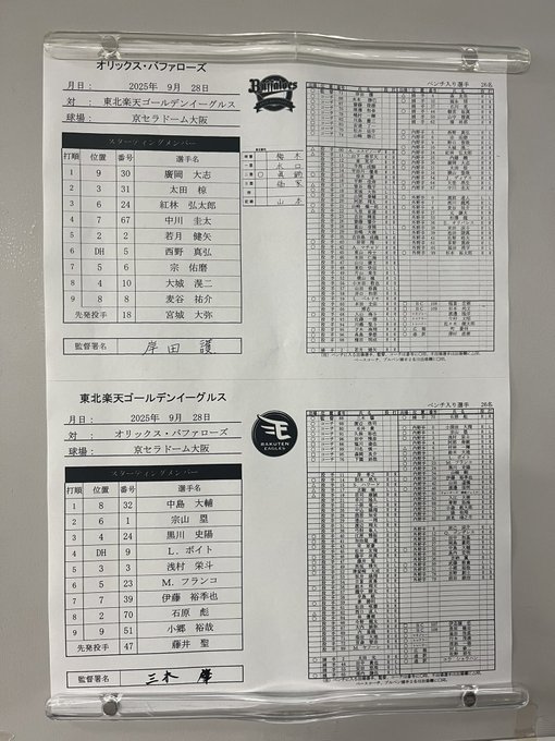 楽天戦(京セラ)のオーダーとメンバー表です!27日の試合で死球を受けた #森友哉 捕手はベンチ外となりました。#オリックス・バファローズ#Bs2025#サンスポ pic.x.com/HOdjyl4kfQ