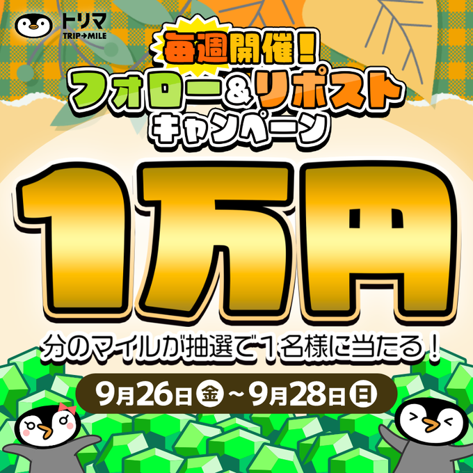 【毎週開催!フォロー&リポストキャンペーン!】大人気ポイ活アプリ『トリマ』は今年で5周年!フォロワー様に感謝の気持ちをこめて、毎週1万円分のマイルをプレゼント!!💰応募方法💰1️⃣@TRIP__MILEをフォロー2️⃣この投稿をリポスト⏰9/26(金)~9/28(日)まで#トリマ速報 #トリマ #ポイ活 pic.x.com/TcjOT3r3Ty