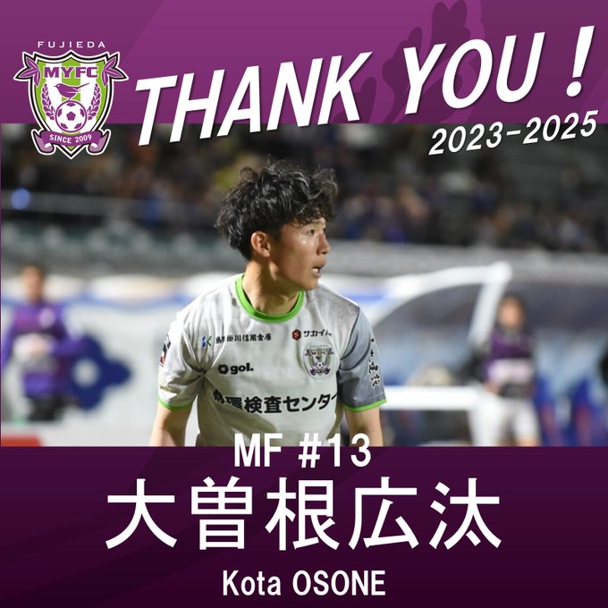 ━━━━━━━━契約・移籍情報━━━━━━━━#大曽根広汰 選手との契約が満了となり、2025シーズンをもってチームを離れることになりましたので、お知らせいたします。myfc.co.jp/news/20251207/…これまでのクラブへの貢献に、あらためて感謝を申し上げます。#藤枝MYFC pic.x.com/GUbScETseO