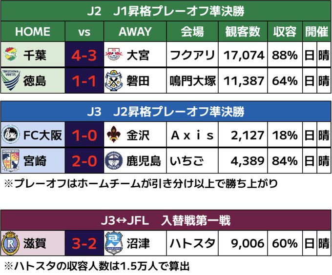 ■昇格プレーオフ&入替戦🟩J1昇格PO大逆転勝利の千葉、ドローに持ち込んだ徳島が決勝進出!→決勝 千葉-徳島@フクアリ🟦J2昇格POFC大阪が鳥取の地で金沢に、宮崎が鹿児島にそれぞれ勝利し決勝進出!※いちごS最多観客を更新→決勝 FC大阪-宮崎@ Axis⬜️J3-JFL入替戦①JFL2位の滋賀が沼津に先勝!※クラブ最多観客を更新→第二戦 沼津-滋賀@愛鷹