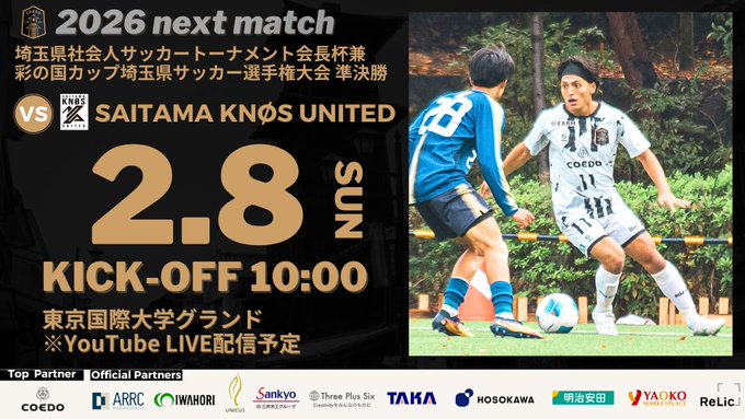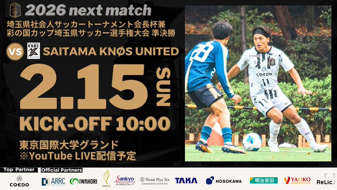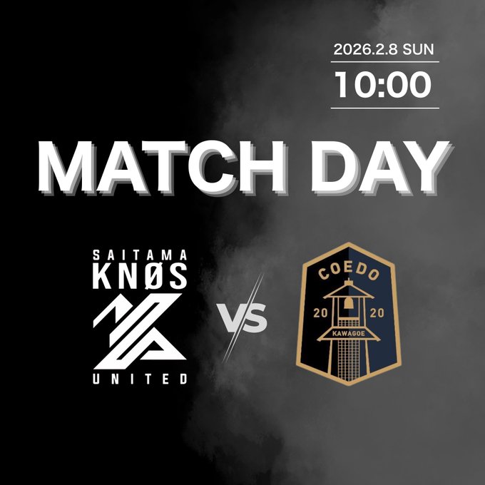 【来週末、彩の国カップ 準決勝⚔️】🏆 彩の国カップ2次予選 準決勝🗓 2月15日(日)10:00 KICK OFF🆚 SAITAMA KNØS UNITED(埼玉県1部)🏟 東京国際大学グランド(坂戸)延期日程が決定。チーム一丸となって次戦に臨みます🔥熱い応援をよろしくお願いします🙌#COEDOKAWAGOEFC pic.x.com/rwP8Pjks0F x.com/coedo_kawagoe/…