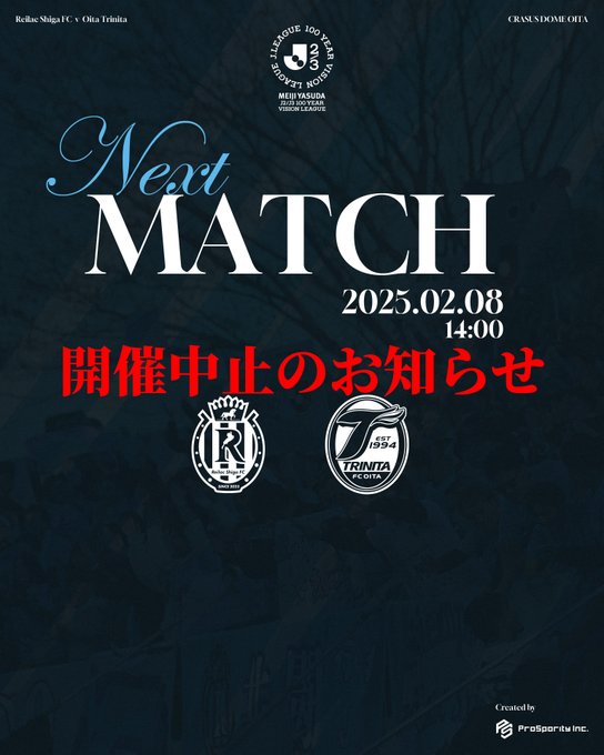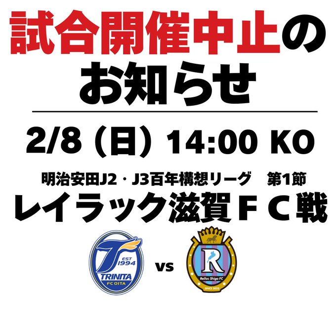【重要※開催中止※】2/8(日)開催の明治安田J2・J3百年構想リーグ第1節 #レイラック滋賀FC は、公共交通機関の運行停止、ドーム周辺の積雪および道路凍結などの状況を踏まえ、お客様の安全を最優先に考慮し、Jリーグ等関係各所と協議した結果、総合的に判断し開催中止とすることを決定いたしましたのでお知らせいたします。なお、代替日については、決定次第改めてお知らせいたします。【中止となった試合のチケットについて】中止試合のチケットの扱いについては、決定次第お知らせいたします。お手元のチケットは取り扱い決定まで大切に保管してください。#大分トリニータ #trinita #創青湧躍 #試合中止